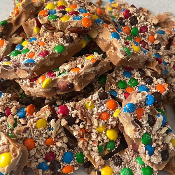 A customer favorite! If you're a fan of peanut butter, you'll love the mellow peanut butter flavor as it collides with quadruple crunch power of mini M & M's, almonds, pecans and my toffee base. One order yields a 2 lb. box. If desired, I can divide your toffee into 4, 8oz. small gift boxes free of charge!